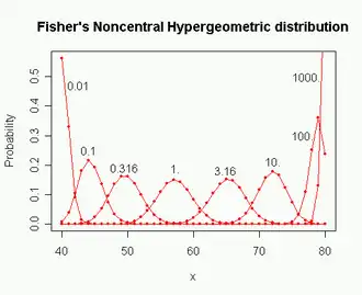 In probability theory and statistics, Fisher's noncentral hypergeometric distribution is a generalization of the hypergeometric distribution where sampling probabilities are modified by weight factors. It can also be defined as the conditional distribution of two or more binomially distributed variables dependent upon their fixed sum.