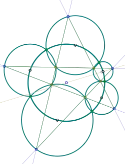 In geometry, the five circles theorem states that, given five circles centered on a common sixth circle and intersecting each other chainwise on the same circle, the lines joining their second intersection points forms a pentagram whose points lie on the circles themselves.