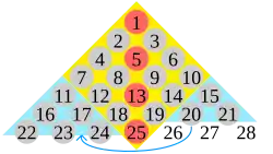 Centered square numbers, highlighted in red, are in found in the center of the odd rows, and are the sum of successive squares – taking 25 as an example, it is the sum of 16 (rotated yellow square) and the next smaller square, 9 (sum of blue triangles)