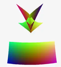 As the principal curvatures are the eigenvalues of the second fundamental form, there are two at each point, and these give rise to two points of the focal surface on each normal direction to the surface. Away from umbilical points, these two points of the focal surface are distinct; at umbilical points the two sheets come together. When the surface has a ridge the focal surface has a cuspidal edge, three such edges pass through an elliptical umbilic and only one through a hyperbolic umbilic.[3] At points where the Gaussian curvature is zero, one sheet of the focal surface will have a point at infinity corresponding to the zero principal curvature.