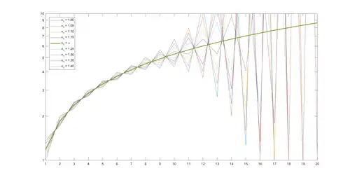 for n = 1, 2, 3, .... The Foias constant is the unique choice α such that if x1 = α then the sequence diverges to infinity. For all other values of x1, the sequence is divergent as well, but it has two accumulation points: 1 and infinity.[1] Numerically, it is