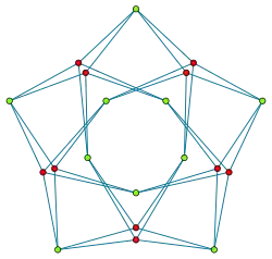 Another construction for the Folkman graph begins with the complete graph on five vertices, . A new vertex is placed on each of the ten edges of , subdividing each edge into a two-edge path. Then, each of the five original vertices of is doubled, replacing it by two vertices with the same neighbors. The ten subdivision vertices form one side of the bipartition of the Folkman graph, and the ten vertices in twin pairs coming from the doubled vertices of form the other side of the bipartition.[3][4]