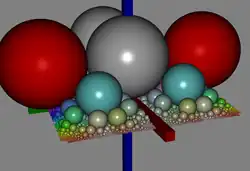 The concept of Ford circles can be generalized from the rational numbers to the Gaussian rationals, giving Ford spheres. In this construction, the complex numbers are embedded as a plane in a three-dimensional Euclidean space, and for each Gaussian rational point in this plane one constructs a sphere tangent to the plane at that point. For a Gaussian rational represented in lowest terms as , the diameter of this sphere should be where represents the complex conjugate of . The resulting spheres are tangent for pairs of Gaussian rationals and with , and otherwise they do not intersect each other.[6][7]