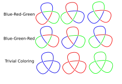 In the mathematical field of knot theory, Fox n-coloring is a method of specifying a representation of a knot group or a group of a link (not to be confused with a link group) onto the dihedral group of order n where n is an odd integer by coloring arcs in a link diagram (the representation itself is also often called a Fox n-coloring). Ralph Fox discovered this method (and the special case of tricolorability) "in an effort to make the subject accessible to everyone" when he was explaining knot theory to undergraduate students at Haverford College in 1956. Fox n-coloring is an example of a conjugation quandle.