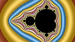 In mathematics, a fractal is a geometric shape containing detailed structure at arbitrarily small scales, usually having a fractal dimension strictly exceeding the topological dimension. Many fractals appear similar at various scales, as illustrated in successive magnifications of the Mandelbrot set.[1][2][3][4] This exhibition of similar patterns at increasingly smaller scales is called self-similarity, also known as expanding symmetry or unfolding symmetry; if this replication is exactly the same at every scale, as in the Menger sponge, the shape is called affine self-similar.[5] Fractal geometry lies within the mathematical branch of measure theory.
