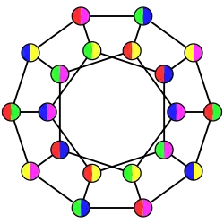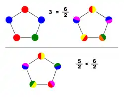Above:A 3:1-coloring of the cycle on 5 vertices, and the corresponding 6:2-coloring.