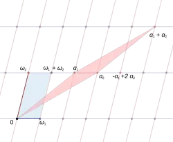 A fundamental pair of periods is a pair of complex numbers such that their ratio is not real. If considered as vectors in , the two are linearly independent. The lattice generated by and is