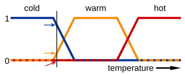 For example, in the image below, the meanings of the expressions cold, warm, and hot are represented by functions mapping a temperature scale. A point on that scale has three "truth values"—one for each of the three functions. The vertical line in the image represents a particular temperature that the three arrows (truth values) gauge. Since the red arrow points to zero, this temperature may be interpreted as "not hot"; i.e. this temperature has zero membership in the fuzzy set "hot". The orange arrow (pointing at 0.2) may describe it as "slightly warm" and the blue arrow (pointing at 0.8) "fairly cold". Therefore, this temperature has 0.2 membership in the fuzzy set "warm" and 0.8 membership in the fuzzy set "cold". The degree of membership assigned for each fuzzy set is the result of fuzzification.