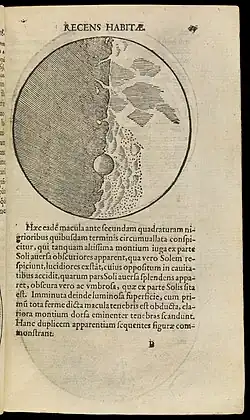 On 30 November 1609, Galileo aimed his telescope at the Moon.[50] While not being the first person to observe the Moon through a telescope (English mathematician Thomas Harriot had done so four months before but only saw a "strange spottednesse"),[51] Galileo was the first to deduce the cause of the uneven waning as light occlusion from lunar mountains and craters. In his study, he also made topographical charts, estimating the heights of the mountains. The Moon was not what was long thought to have been a translucent and perfect sphere, as Aristotle claimed, and hardly the first "planet", an "eternal pearl to magnificently ascend into the heavenly empyrian", as put forth by Dante. Galileo is sometimes credited with the discovery of the lunar libration in latitude in 1632,[52] although Thomas Harriot or William Gilbert may have done so before.[53]