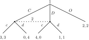 The extensive form can also capture simultaneous-move games and games with imperfect information. To represent it, either a dotted line connects different vertices to represent them as being part of the same information set (i.e. the players do not know at which point they are), or a closed line is drawn around them. (See example in the imperfect information section.)
