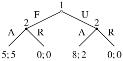 The game pictured consists of two players. The way this particular game is structured (i.e., with sequential decision making and perfect information), Player 1 "moves" first by choosing either F or U (fair or unfair). Next in the sequence, Player 2, who has now observed Player 1's move, can choose to play either A or R (accept or reject). Once Player 2 has made their choice, the game is considered finished and each player gets their respective payoff, represented in the image as two numbers, where the first number represents Player 1's payoff, and the second number represents Player 2's payoff. Suppose that Player 1 chooses U and then Player 2 chooses A: Player 1 then gets a payoff of "eight" (which in real-world terms can be interpreted in many ways, the simplest of which is in terms of money but could mean things such as eight days of vacation or eight countries conquered or even eight more opportunities to play the same game against other players) and Player 2 gets a payoff of "two".
