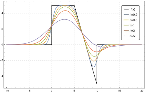 For small values of , is very close to , but smooth. The larger , the more this operator averages out and changes . Physically, corresponds to following the heat (or diffusion) equation for time units, and this is additive, corresponding to "diffusing for time units, then time units, is equivalent to diffusing for time units". One can extend this to by setting to be the identity operator (i.e. convolution with the Dirac delta function), and these then form a one-parameter semigroup of operators.