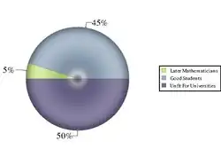 Otto Toeplitz had alleged that only 5% of the class can be reached by the traditional axiomatic approaches. To engage 45% of the students, he suggested to expose the students to the history of mathematics. The history of mathematics would give students an idea of the challenges and the elements of mathematics research process and applications. Furthermore, Toeplitz claimed that 50% of the students in universities were not 'reachable' and were 'unfit' for university education. The classification is illustrated in the picture.