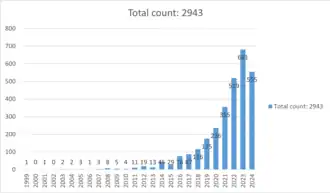 As of 1 January 2025, there are 2,944 known megaprimes[6] which have more than 1,000,000 digits.[7] The first to be found was the Mersenne prime 26972593−1 with 2,098,960 digits, discovered in 1999 by Nayan Hajratwala, a participant in the distributed computing project GIMPS.[8][9] Nayan was awarded a Cooperative Computing Award from the Electronic Frontier Foundation for this achievement.