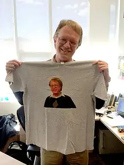 ![]() Van Brummelen holding a t-shirt of Van Brummelen. |