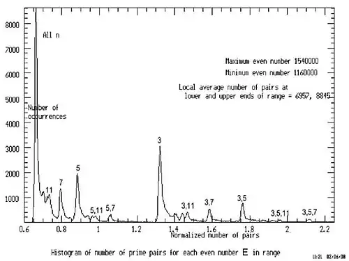 Such a histogram appears on the right. A series of well-defined peaks is evident. Each of these peaks can be identified as being formed by a set of values of which have certain smallest factors. The major peaks correspond to lowest factors of 3, 5, 7 ... as labeled. As the lowest factors become higher the peaks move left and eventually merge to give the lowest value primary peak.