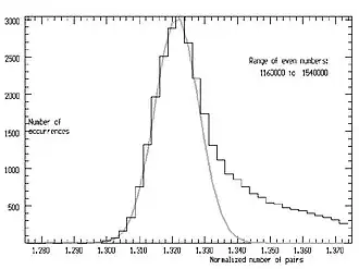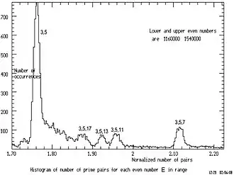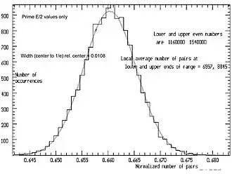 When histograms are formed for different average values of E, the width of this (primes only) peak is found to be proportional to . However, it is a factor of about 1.85 less than the value that would be expected from a hypothesis of totally random occurrence of prime-pair matching. This may be expected, since there are correlations that give rise to the separated peaks in the total histogram.