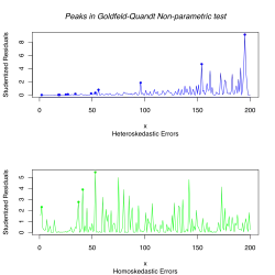 - ↑ Goldfeld, Stephen M.; Quandt, R. E. (June 1965). "Some Tests for Homoscedasticity". Journal of the American Statistical Association. 60 (310): 539–547. doi:10.1080/01621459.1965.10480811. JSTOR 2282689.