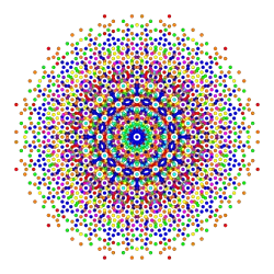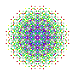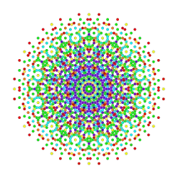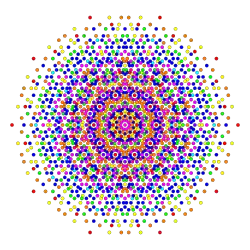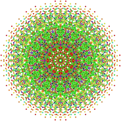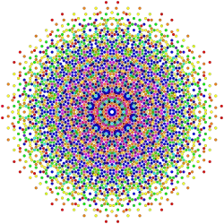 Petrie polygon projections are 12, 18, or 30-sided based on the E6, E7, and E8 symmetries (respectively). The 2160 vertices are all displayed, but lower symmetry forms have projected positions overlapping, shown as different colored vertices. For comparison, a B6 coxeter group is also shown.