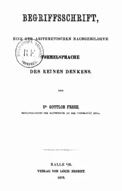 - 1879. Begriffsschrift, eine der arithmetischen nachgebildete Formelsprache des reinen Denkens. Halle a. S.: Louis Nebert. Translation: Concept Script, a formal language of pure thought modelled upon that of arithmetic, by S. Bauer-Mengelberg in Jean Van Heijenoort, ed., 1967. From Frege to Gödel: A Source Book in Mathematical Logic, 1879–1931. Harvard University Press.
