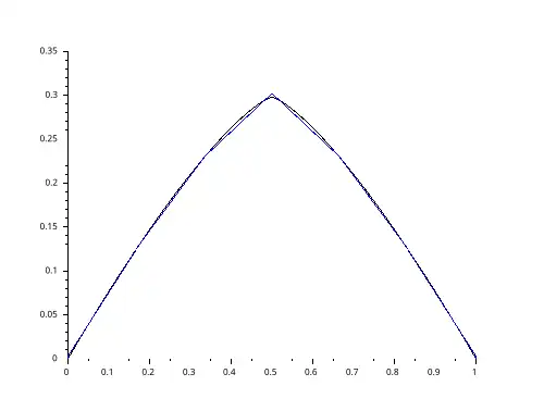 of the p-Laplace problem on the domain [0,1] with (black line) and approximate one (blue line) computed with the first degree discontinuous Galerkin method plugged into the GDM (uniform mesh with 6 elements).