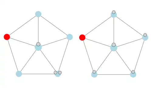 Right: A game which cannot be won, despite having more pebbles than the left, because no moves can be made with singly pebbled vertices. This means that π(G), the pebbling number of this graph, must be at least 6.