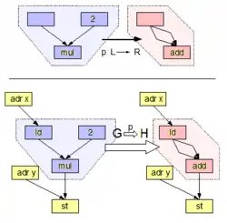 Top: Example graph rewrite rule (optimization from compiler construction: multiplication with 2 replaced by addition). Bottom: Application of the rule to optimize "y=x*2" into "y=x+x".
