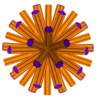 In Magnus Wenninger's Dual Models, it is represented with intersecting infinite prisms passing through the model center, cut off at a certain point that is convenient for the maker. Wenninger suggested these figures are members of a new class of stellation polyhedra, called stellation to infinity. However, he also acknowledged that strictly speaking they are not polyhedra because their construction does not conform to the usual definitions.