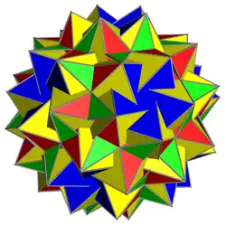 The edges and triangular faces also occur in the compound of twenty octahedra. In addition, 20 of the triangular faces occur in one enantiomer of the compound of twenty tetrahemihexahedra, and the other 60 triangular faces occur in the other enantiomer.