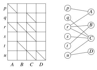 As Ethan Bolker and Henry Crapo (1977) originally observed, the grid bracing problem can be translated into a problem in graph theory by considering an undirected bipartite graph that has a vertex for each row and column of the given grid, and an edge for each cross-braced rectangle or square of the grid. They proved that the cross-braced grid is rigid if and only if this bipartite graph is connected. It follows that the minimal cross-bracings of the grid correspond to the trees connecting all vertices in the graph, and that they have exactly cross-braced squares. Any overbraced but rigid cross-bracing (with more than this number of cross-braced cells) can be reduced to a minimal cross-bracing by finding a spanning tree of its graph.[1][2][3][4]