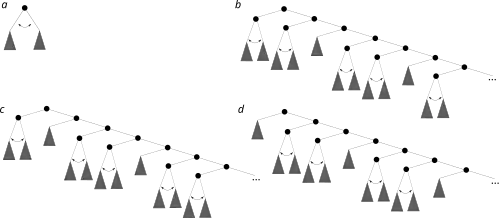 To understand the effect of the latter operations, consider the rightmost branch B of T2, which begins {∅, 1, 11, 111, ...}. As a branch, B is order-isomorphic to The original tree T2 can be obtained by rooting a tree isomorphic to T2 at each element of B; conversely, one can decompose T2 into isomorphic subtrees indexed by elements of .