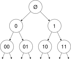 Although initially the Grigorchuk group was defined as a group of Lebesgue measure-preserving transformations of the unit interval, at present this group is usually given by its realization as a group of automorphisms of the infinite regular binary rooted tree T2. The tree T2 is the set Σ* of all finite strings in the alphabet Σ = {0,1}, including the empty string ∅, which roots T2. For a vertex x of T2 the string x0 is the left child of x and the string x1 is the right child of x in T2. The group of all automorphisms Aut(T2) can thus be thought of as the group of all length-preserving permutations σ of Σ* that also respect the initial segment relation: whenever a string x is an initial segment of a string y then σ(x) is an initial segment of σ(y).