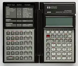The HP-28 calculators shared a flip-open ("clamshell") case. On the left side of the flip, there is an alphabetic keyboard (in alphabetic order). On the right was a typical scientific keyboard layout.
