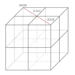 n; combinatorial lines correspond to rows, columns, and (some of the) diagonals of the hypercube. The Hales–Jewett theorem then states that for given positive integers n and c, there exists a positive integer H, depending on n and c, such that for any partition of WH