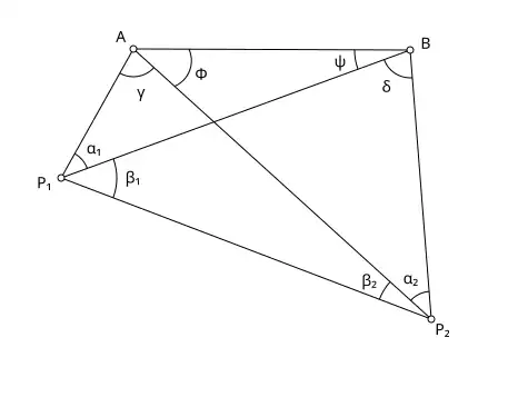 In trigonometry, Hansen's problem is a problem in planar surveying, named after the astronomer Peter Andreas Hansen (1795–1874), who worked on the geodetic survey of Denmark. There are two known points A, B, and two unknown points P1, P2. From P1 and P2 an observer measures the angles made by the lines of sight to each of the other three points. The problem is to find the positions of P1 and P2. See figure; the angles measured are (α1, β1, α2, β2).