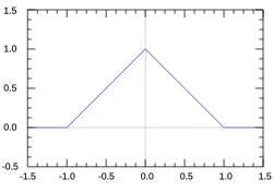 A triangular function (also known as a triangle function, hat function, or tent function) is a function whose graph takes the shape of a triangle. Often this is an isosceles triangle of height 1 and base 2 in which case it is referred to as the triangular function. Triangular functions are useful in signal processing and communication systems engineering as representations of idealized signals, and the triangular function specifically as an integral transform kernel function from which more realistic signals can be derived, for example in kernel density estimation. It also has applications in pulse-code modulation as a pulse shape for transmitting digital signals and as a matched filter for receiving the signals. It is also used to define the triangular window sometimes called the Bartlett window.