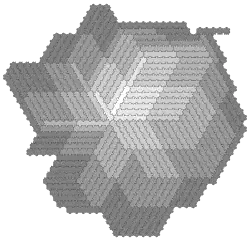 Consider the non-convex polygon P shown in the figure to the right, which is formed from a regular hexagon by adding projections on two of its sides and matching indentations on three sides. The figure shows a tessellation consisting of 61 copies of P, one large infinite region, and four small diamond-shaped polygons within the fourth layer. The first through fourth coronas of the central polygon consist entirely of congruent copies of P, so its Heesch number is at least four. One cannot rearrange the copies of the polygon in this figure to avoid creating the small diamond-shaped polygons, because the 61 copies of P have too many indentations relative to the number of projections that could fill them. By formalizing this argument, one can prove that the Heesch number of P is exactly four. According to the modified definition that requires that coronas be simply connected, the Heesch number is three. This example was discovered by Robert Ammann.[5]