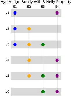 A hypergraph is equivalent to a set-family. In hypergraphs terms, a hypergraph H = (V, E) has the Helly property if for every n hyperedges in E, if , then .[10]: 467 For every hypergraph H, the following are equivalent:[10]: 470–471