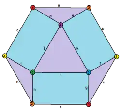 Its dual polyhedron is a rhombic hemi-dodecahedron which has 7 vertices (1-7), 12 edges (a-l), and 6 rhombic faces (A-F).