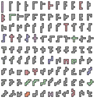 - 84 heptominoes (coloured grey) have no symmetry. Their symmetry group consists only of the identity mapping.