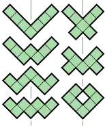 - 7 heptominoes (coloured green) have an axis of reflection symmetry at 45° to the gridlines. Their symmetry group has two elements, the identity and a diagonal reflection.