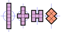- 3 heptominoes (coloured purple) have two axes of reflection symmetry, both aligned with the gridlines. Their symmetry group has four elements, the identity, two reflections and the 180° rotation. It is the dihedral group of order 2, also known as the Klein four-group.