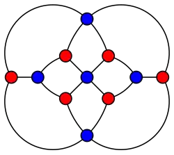 The Herschel graph is a polyhedral graph; this means that it is a planar graph, one that can be drawn in the plane with none of its edges crossing, and that it is 3-vertex-connected: the removal of any two of its vertices leaves a connected subgraph.[1] It is a bipartite graph: when it is colored with five blue and six red vertices, as illustrated, each edge has one red endpoint and one blue endpoint.[2]