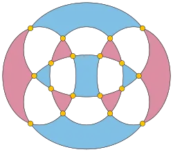 The Herschel graph has three vertices of degree four (the three blue vertices aligned vertically in the center of the illustration) and eight vertices of degree three. Each two distinct degree-four vertices share two degree-three neighbors, forming a four-vertex cycle with these shared neighbors. There are three of these cycles, passing through six of the eight degree-three vertices (red in the illustration). Two more degree-three vertices (blue) do not participate in these four-vertex cycles; instead, each is adjacent to three of the six red vertices.[1]