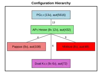 Removing from the Hesse configuration the three lines belonging to a single triple produces a self dual configuration (93) or , the Pappus configuration.[6][7] The Pappus configuration has 18×3! = 108 automorphisms.
