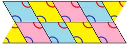 Each color/face can also be exposed in more than one way. In figure 6, for example, each blue triangle has at the center its corner decorated with a wedge, but it is also possible, for example, to make the ones decorated with Y's come to the center. There are 18 such possible configurations for triangles with different colors, and they can be seen by flexing the hexahexaflexagon in all possible ways in theory, but only 15 can be flexed by the ordinary hexahexaflexagon. The 3 extra configurations are impossible due to the arrangement of the 4, 5, and 6 tiles at the back flap. (The 60-degree angles in the rhombi formed by the adjacent 4, 5, or 6 tiles will only appear on the sides and never will appear at the center because it would require one to cut the strip, which is topologically forbidden.)