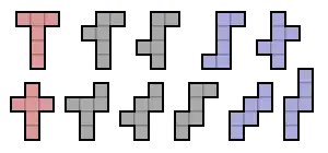 • The twenty grey hexominoes have no symmetry. Their symmetry group consists only of the identity mapping.