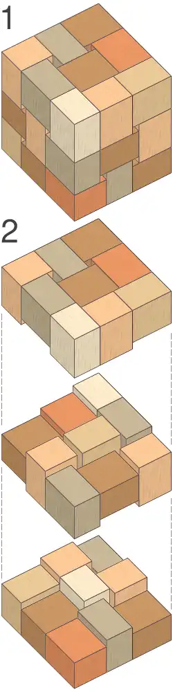 The puzzle itself consists only of 27 identical rectangular cuboid-shaped blocks, although physical realizations of the puzzle also typically supply a cubical box to fit the blocks into. If the three lengths of the block edges are x, y, and z, then the cube should have edge length x + y + z. Although the puzzle can be constructed with any three different edge lengths, it is most difficult when the three edge lengths of the blocks are close enough together that x + y + z < 4 min(x,y,z), as this prevents alternative solutions in which four blocks of the minimum width are packed next to each other. Additionally, having the three lengths form an arithmetic progression can make it more confusing, because in this case placing three blocks of the middle width next to each other produces a row of the correct total width but one that cannot lead to a valid solution to the whole puzzle.[2]