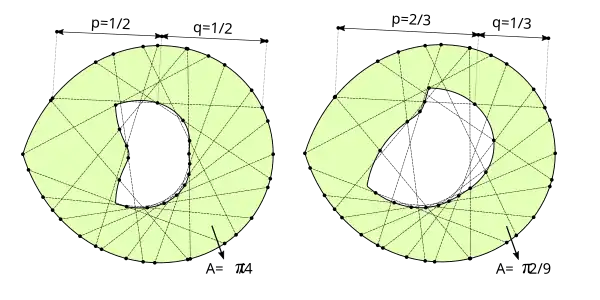 In plane geometry, Holditch's theorem states that if a chord of fixed length is allowed to rotate inside a convex closed curve, then the locus of a point on the chord a distance p from one end and a distance q from the other is a closed curve whose enclosed area is less than that of the original curve by . The theorem was published in 1858 by Rev. Hamnet Holditch.[1][2] While not mentioned by Holditch, the proof of the theorem requires an assumption that the chord be short enough that the traced locus is a simple closed curve.[3]