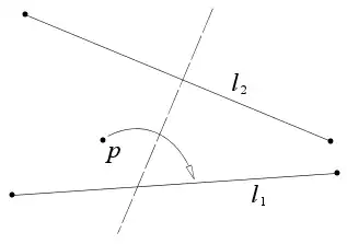 This is equivalent to finding a bisector of the angle between l1 and l2. Let p1 and p2 be any two points on l1, and let q1 and q2 be any two points on l2. Also, let u and v be the unit direction vectors of l1 and l2, respectively; that is: